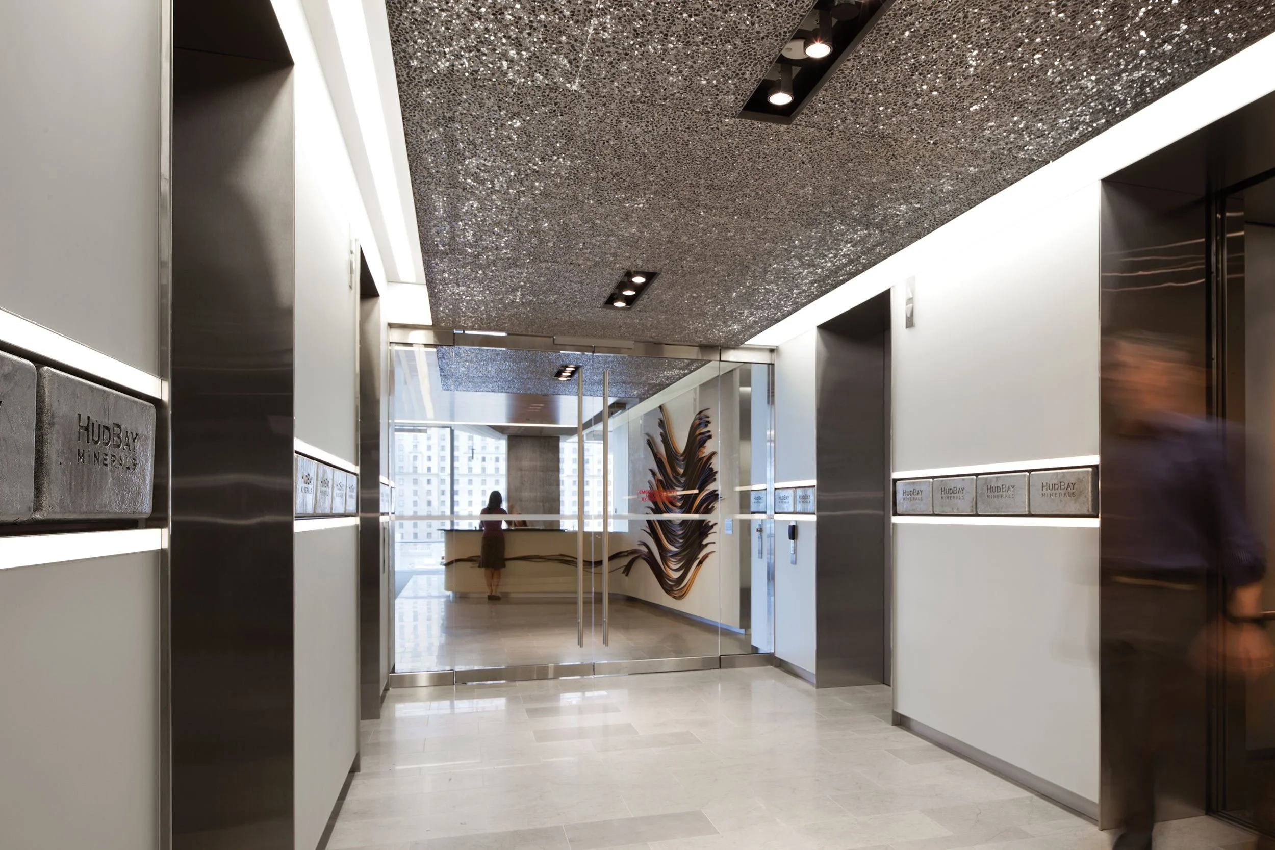 The new head offices for HudBay Minerals Inc. occupy the 8th floor of the Telus Building at 25 York Street. The client is a Canadian integrated mining company principally focused on the discovery, production and marketing of base metals.The interiors have been designed to LEED Silver CI, in keeping with the base building LEED standards, and to reinforce the company’s environmental commitment to sustainable strategies. The design was inspired by images from the company’s extensive photo library, ranging from the mining of the raw materials to the smelting processes and the finished products. The story begins at the elevator foyer, where actual ingots of raw zinc, containing the HudBay stamp, have been mounted along each wall. The ceiling is composed of panels of recycled spun aluminum, whose open cells allow light from above to filter through. This also evokes the netting that wraps the ceilings of the mines. Stepping into the reception area, a dramatic view of the Toronto skyline is framed on one side by three freestanding stone walls that define a large meeting room, and on the other by a commissioned installation by Toronto artist Dennis Lim. The walls are comprised of rough split face stone, inspired by a HudBay photo of vertical cliffs that have been hewn from the rock, while the installation of copper and walnut evokes both the strata of the earth and the sinuous line of copper as it is poured into moulds in the company’s foundries.