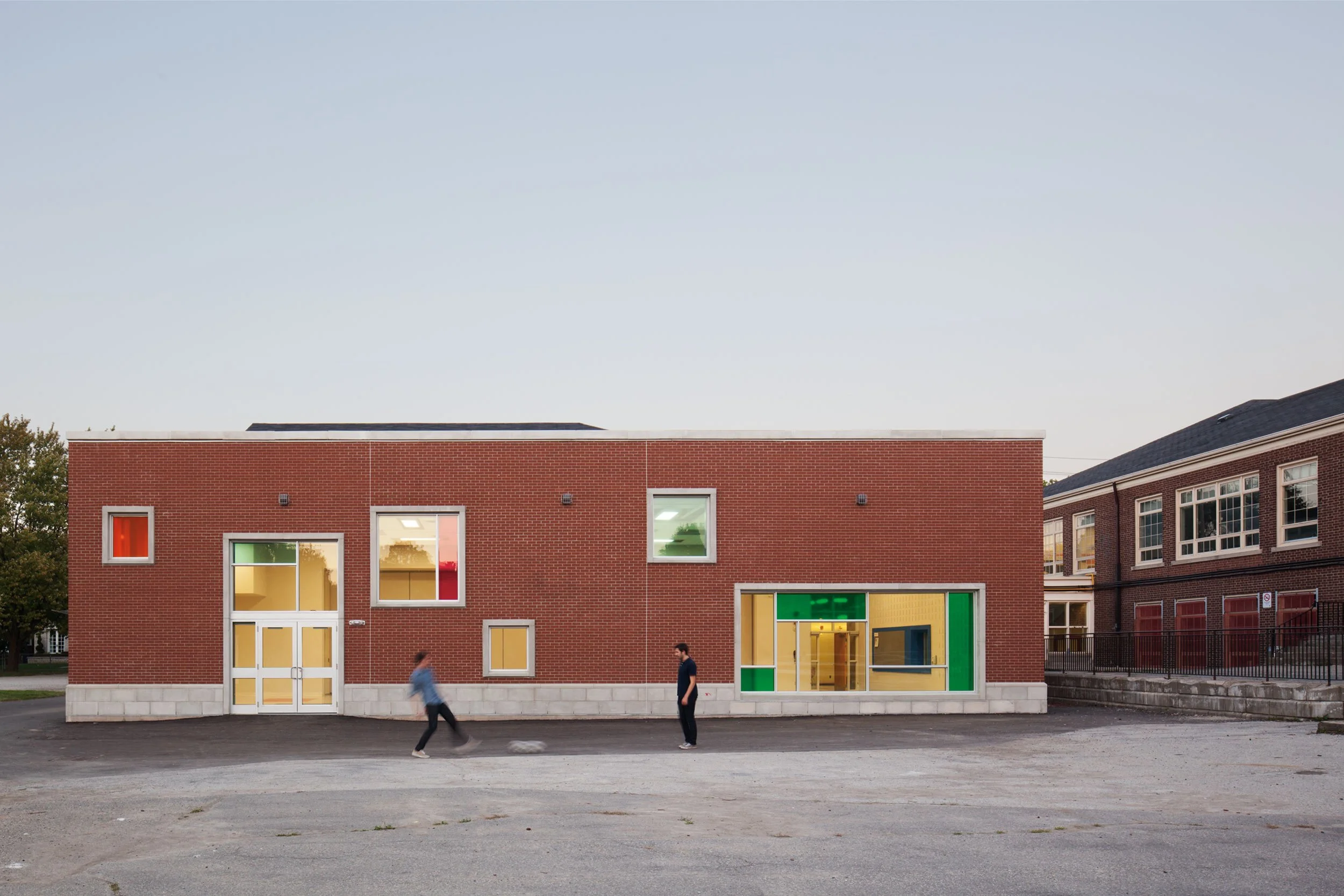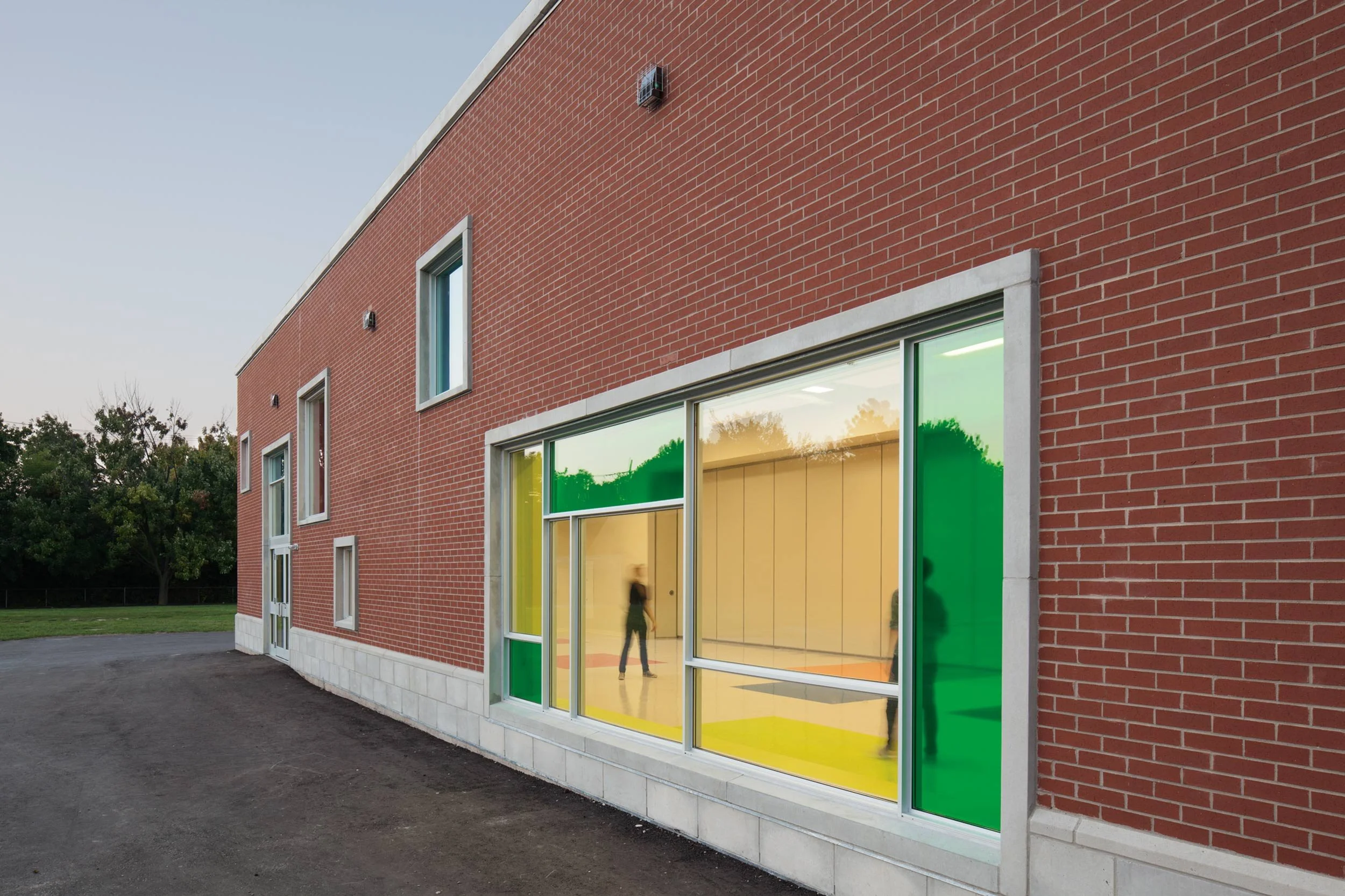The addition is designed as a simple brick box that ties visually into the existing gym, yet also distinguishes itself by a random play of windows that “dance” across the facades, creating a whimsical composition. Inside, these windows are framed by deep surrounds of colour. The use of colour to animate the space is also carried onto the floor pattern, as well as with the use of different coloured window films that will be applied to portions of the windows, casting coloured shadows onto the floor as the sun moves around the building.