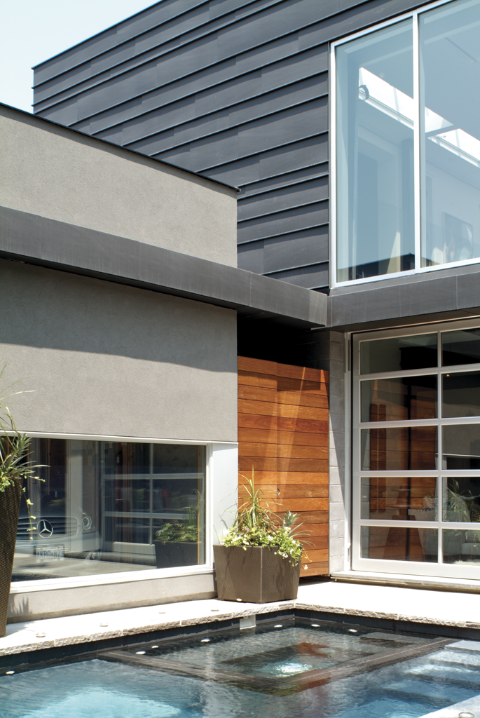 The design addresses the tightness and public nature of its urban site with the creation of a private courtyard with a plunge pool through the addition of a freestanding garage. The dynamic exterior composition consists of a material palette of black standing seam zinc, grey concrete block, stucco and clear anodized aluminum. Ipe, a sustainably harvested rainforest wood, is incorporated on the gate to the courtyard at the front entrance, on courtyard walls, and on the deck, to bring warm, natural touches to the project.