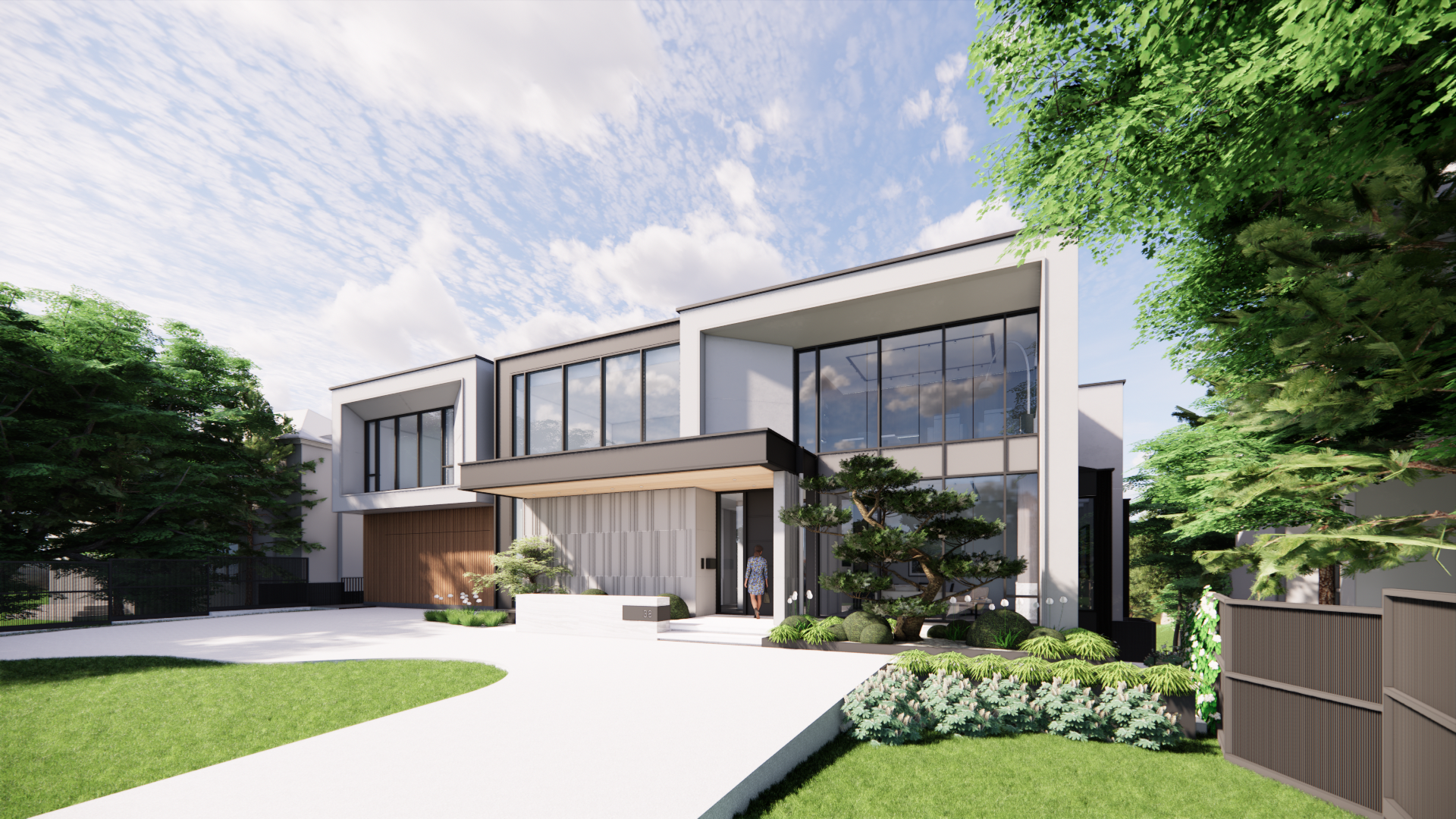 Set well back from the street, sheltered by a grove of mature trees, this new Toronto residence rises from a sloping ravine with quiet drama. Its front façade—defined by deeply recessed windows set within GFRC frames and a twenty nine-foot long cantilevered canopy—establishes a bold yet refined architectural presence.