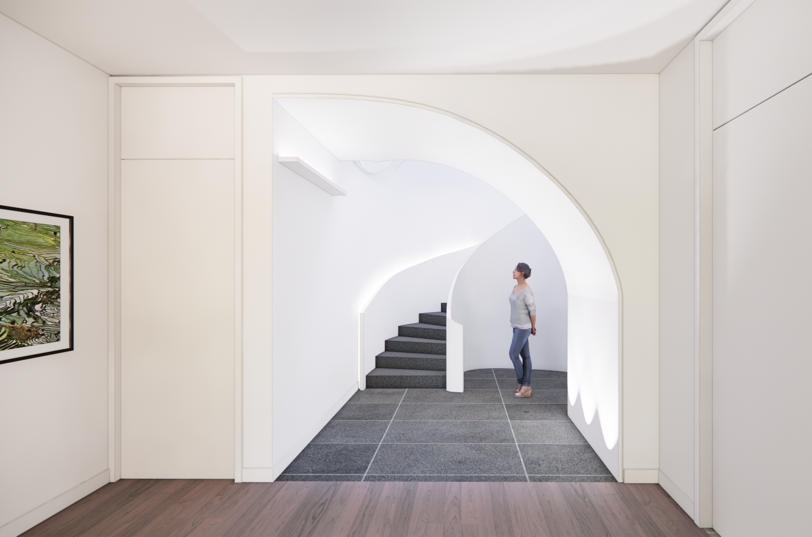 Inside, the ground floor centers on the great room that is open to an eat-in kitchen, a large dining room that can seat up to 30 people, and the primary bedroom suite. A sculptural stair winds through the house, descending to a multi-purpose media room separated from the indoor pool by a switchable glass wall, along with change rooms and gym, and ascending to five bedrooms and a dedicated office at the second floor.