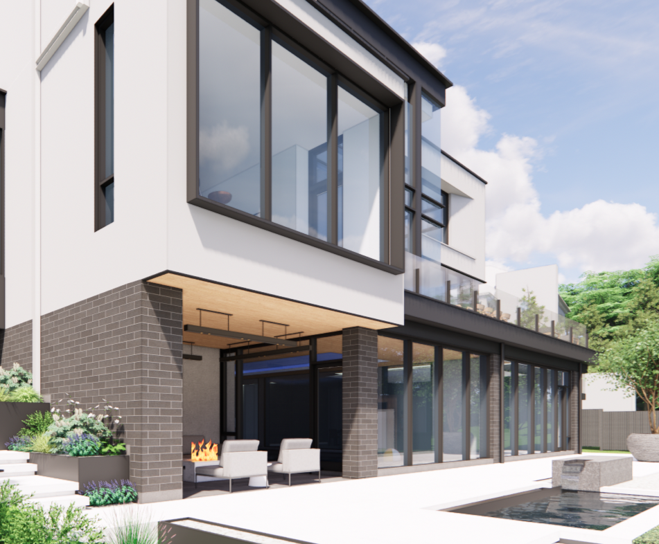 The exterior is clad in EIFS with a base of black brick that is gradually revealed as the house steps down the sloped site. Beneath the front canopy, randomly ribbed GFRC panels provide texture and rhythm to the front entry wall. At the rear, a covered outdoor room at the walk-out basement, next to an indoor swimming pool, looks out to the backyard and views of the ravine.