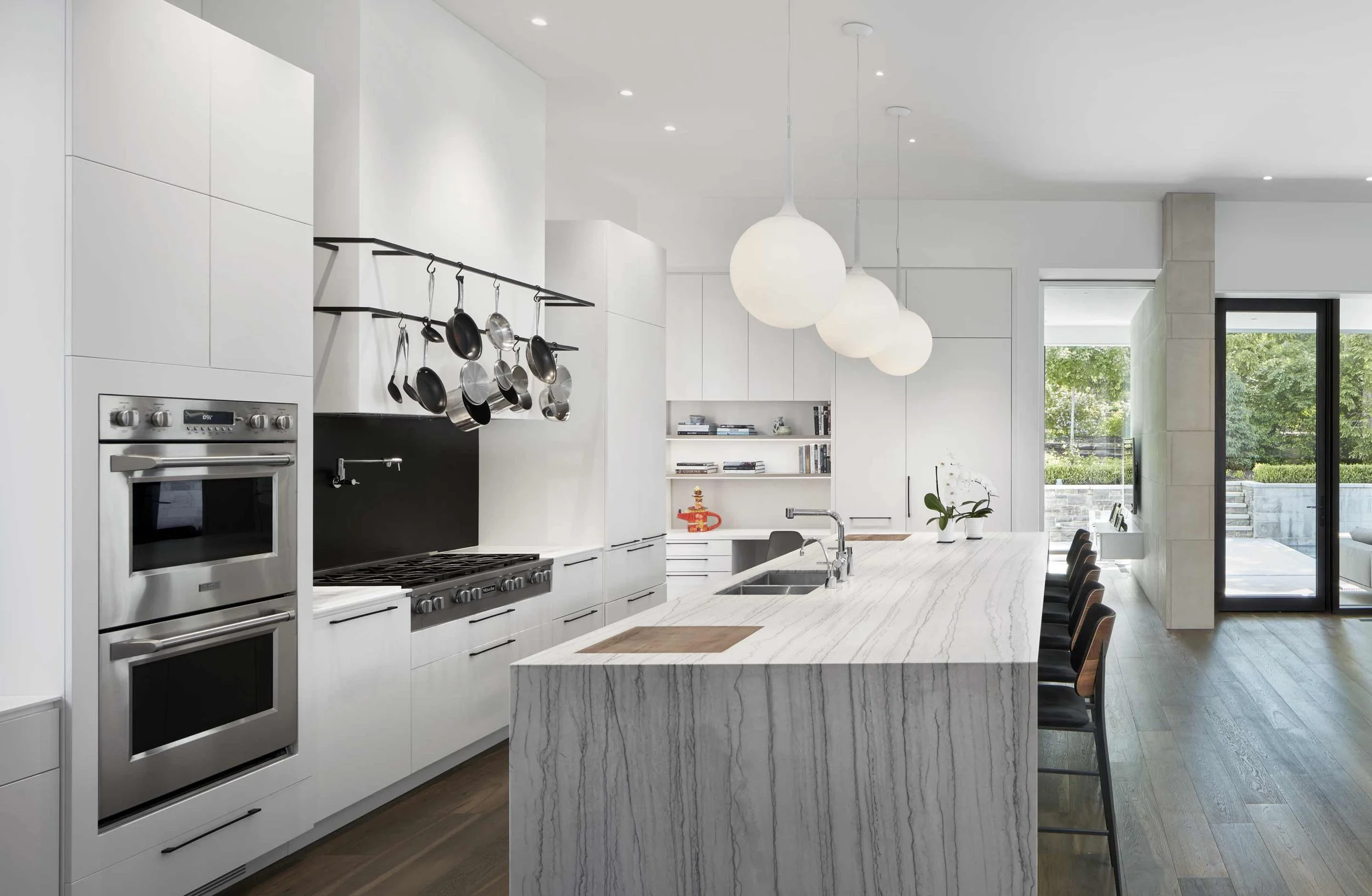 The new house, nestled comfortably between its neighbours, occupies a similar footprint to the residence formerly on the site. The exterior is clad in large slabs of Indiana Limestone with a base of split faced Ontario Algonquin stone that ties it materially into the vernacular of the neighbourhood, while standing out through careful contemporary detailing.